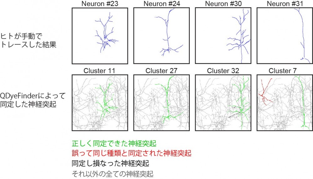 QDyeFinderにおいては、7種類の蛍光タンパク質の組み合わせによって標識された神経細胞の蛍光画像(図1)から神経突起を同定し、色情報だけを使って同じ種類の神経細胞由来の神経突起をグループ化した。ここでは4例のみ示す。ヒトが手動で神経突起を同定した結果と比較したところ、概ね同程度の精度で同じ神経細胞由来の神経突起を同定できることが判明した。