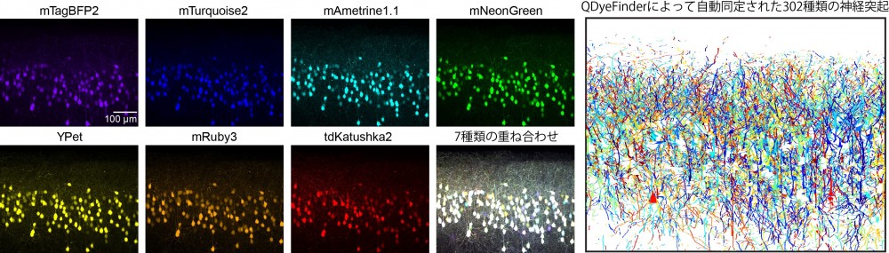 九州大学大学院医学研究院の今井猛教授、マーカス・ルーウィ助教(研究当時)、藤本聡志助教、馬場俊和大学院生らの研究グループは、まず神経細胞を7種類の蛍光タンパク質の組み合わせによって多色標識することに成功しました。従来、3種類程度の蛍光タンパク質の組み合わせで標識することは行われていましたが、7種類の色素を用いることで、色の組み合わせは飛躍的に増えました。しかし、7種類の色素の組み合わせは、ヒトの目で識別することは困難です。そこで、本研究では、色の識別を実現するプログラムを開発し、これを7原色に拡張しました。具体的には、多次元データを分類できる新たなプログラム dCrawlerを開発しました。さらに、dCrawlerを使って神経突起の色情報を分類し、似た色の組み合わせをもつ神経突起を自動同定するプログラムQDyeFinderを開発しました。これによって、色情報だけに基づいて、多くの神経突起の配線の様子を自動解析することに成功しました。このように、「超多色」標識と7原色の色表現の自動解析によって、神経回路の配線の解析が飛躍的に向上しました。