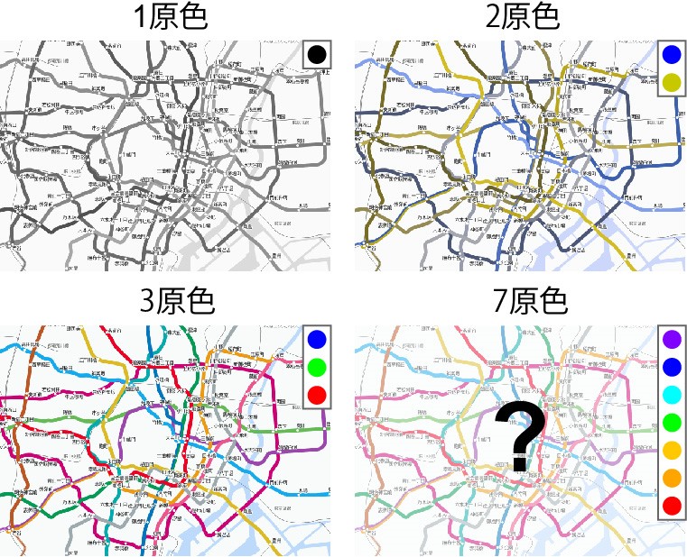 そこで本研究では、用いる蛍光タンパク質の種類を増やすことで、もっと多くの神経細胞を識別することを考えました。3種類の色素の組み合わせで表現できるのは3原色の世界です。これは1色もしくは2原色の世界よりもカラフルな世界です。1~3原色で表示した東京の地下鉄マップを見れば、一目瞭然でしょう(図1)。原理的には、色素の数を増やし、4原色、5原色というように増やしていけば、より多くの色の組み合わせを作り出すことができ、識別能も向上するはずです。しかしながら、多くのヒトは3色色覚(※3)であり、3原色の世界までしか識別することができません。4原色以上の識別は、ヒトの目では不可能であり、AIに任せるより仕方ありません。そこで本研究では、4原色以上の世界を識別できるようなプログラムを開発しました。
