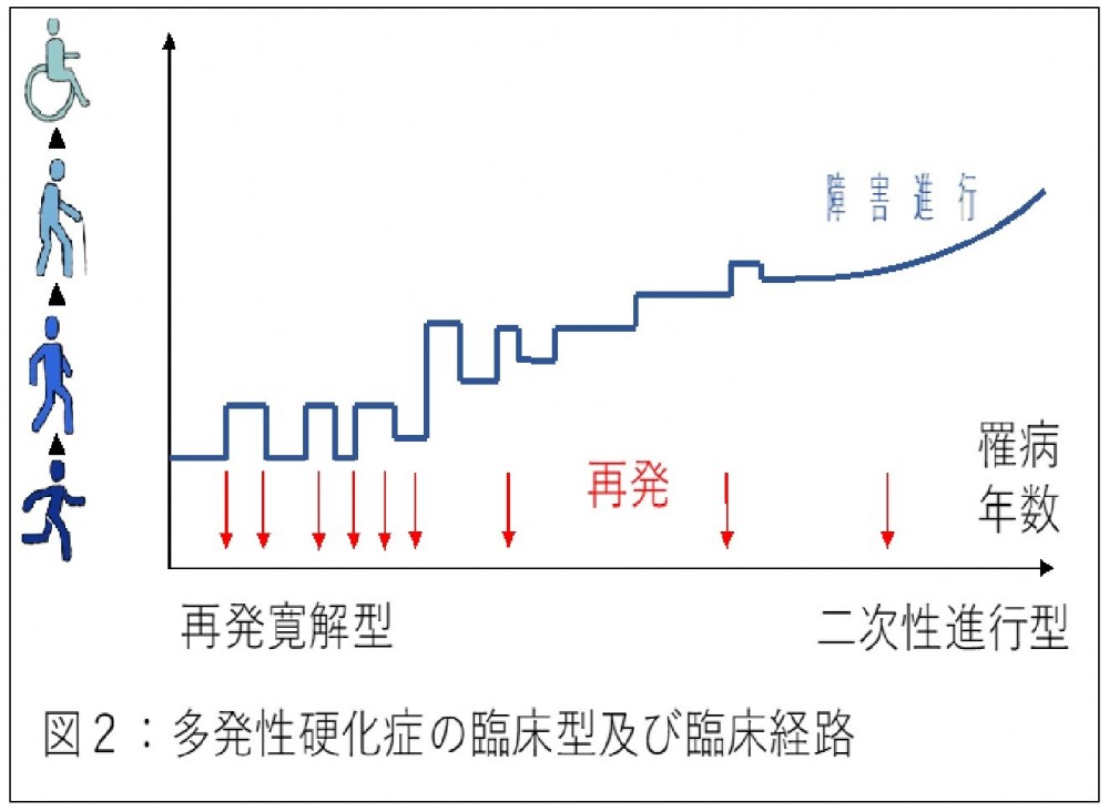 MS患者は、脳脊髄に多発性病変を生じ、活動性の病変部は造影されます(図1)。MSの病変部では、脳脊髄の神経を被覆している髄鞘(ミエリン)に対する自己免疫反応により髄鞘が破壊され(脱髄)、神経伝導の障害をきたします。脱髄を繰り返したり、脱髄が遷延したりすると、露出した神経線維自体にも障害がおよび、不可逆的障害をきたすこともあります。MSの多くは再発と寛解を繰り返す再発寛解型MS (RRMS)の経過をとります。一部の症例では、経過中、再発によらない病態の進行、障害の蓄積が生じ、二次性進行型MS(SPMS)に移行します(図2)。