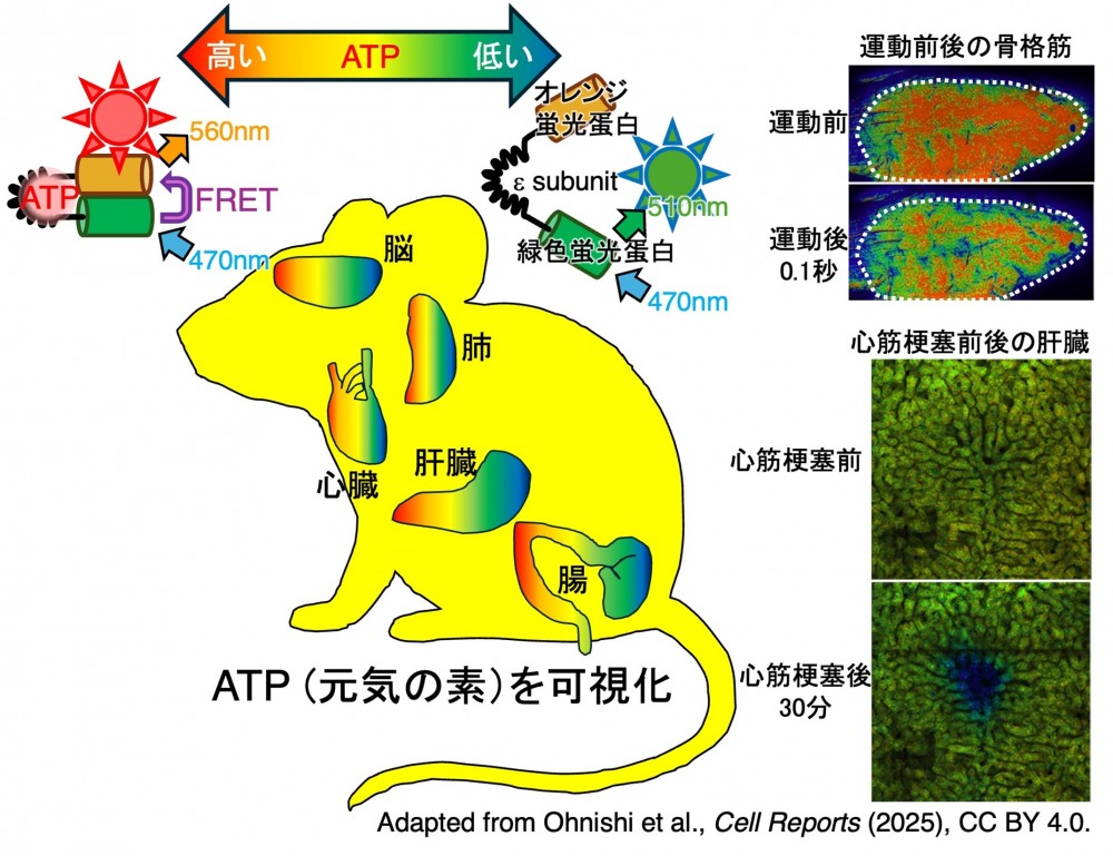 本研究では、全身の臓器のエネルギー状態 (ATP濃度) をリアルタイムに観察できるよう、マウスの体に特殊な蛍光センサーを発現させた「ATP 可視化マウス (AVIDマウス)」を開発。エネルギー変化の“見える化”に成功しました。 (上図)