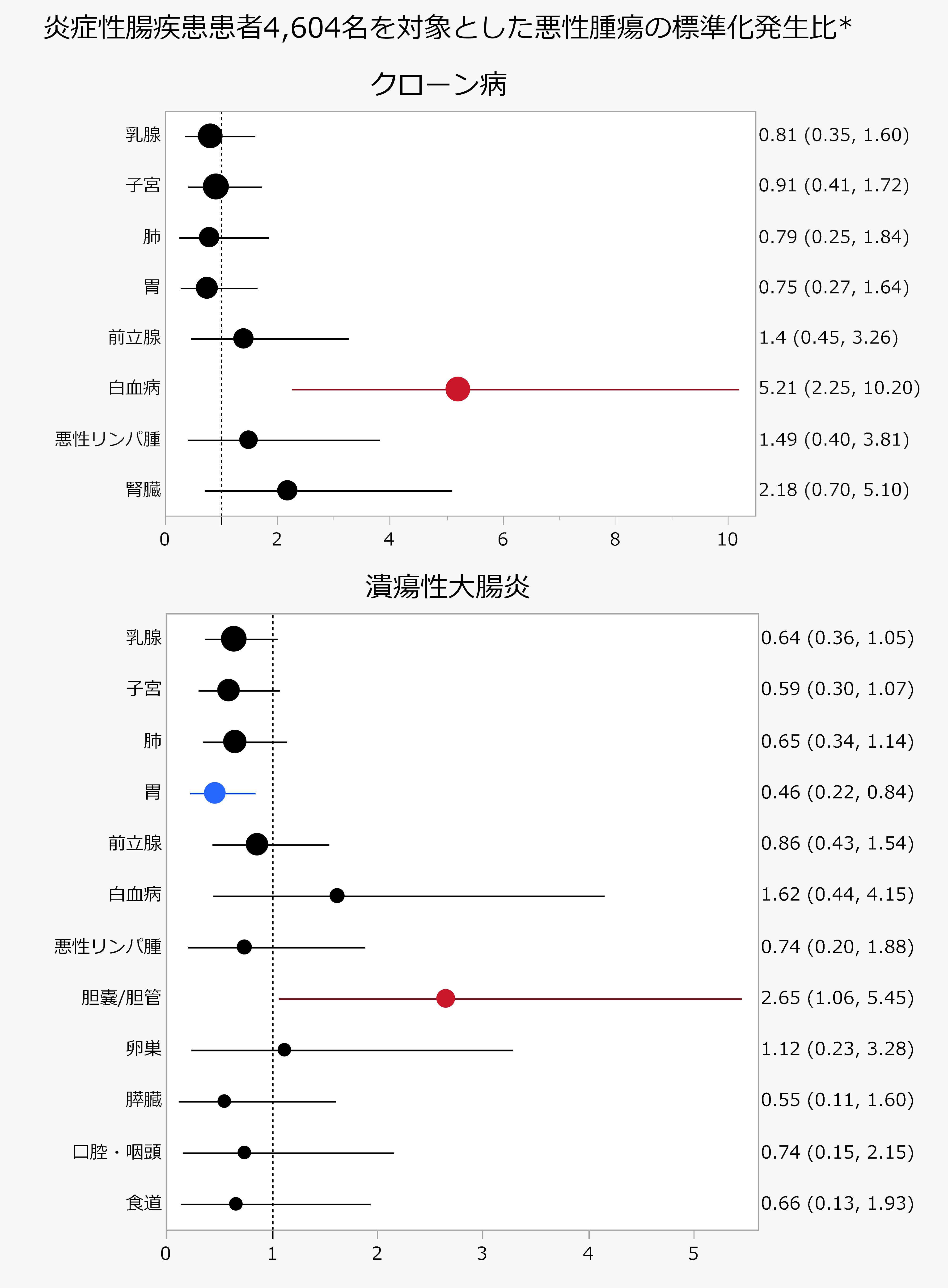 本研究では、2008年から2020年までに九州地域の11施設で診療を受けた4,604名の炎症性腸疾患患者のデータを解析し、腸管外悪性腫瘍の発生頻度を日本の一般人口と比較しました。その結果、クローン病患者では白血病の発生率が一般人口と比べて有意に高く、標準化発生比*6は5.21と約5倍に達することが明らかとなりました (図上、赤で示した部分)。一方、西洋の報告で見られる悪性リンパ腫の増加は認められず、日本における炎症性腸疾患患者の特異的な腫瘍発生パターンが示唆されました。さらに潰瘍性大腸炎患者では、胆嚢・胆管がんの発生率が一般人口より高く、原発性硬化性胆管炎 (PSC)*7の合併が強い関連を持つことも確認されました (図下、赤で示した部分)。対照的に、潰瘍性大腸炎では胃がんの発生が一般人口より少なく (図下、青で示した部分)、その背景としてヘリコバクター・ピロリ感染率の低さが影響している可能性が推察されます。
