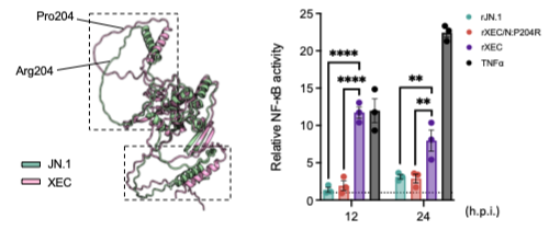 XEC 変異株で獲得されたヌクレオカプシドタンパク質の R204P 変異は構造変化に伴って、NF-κB 活性化に寄与する。