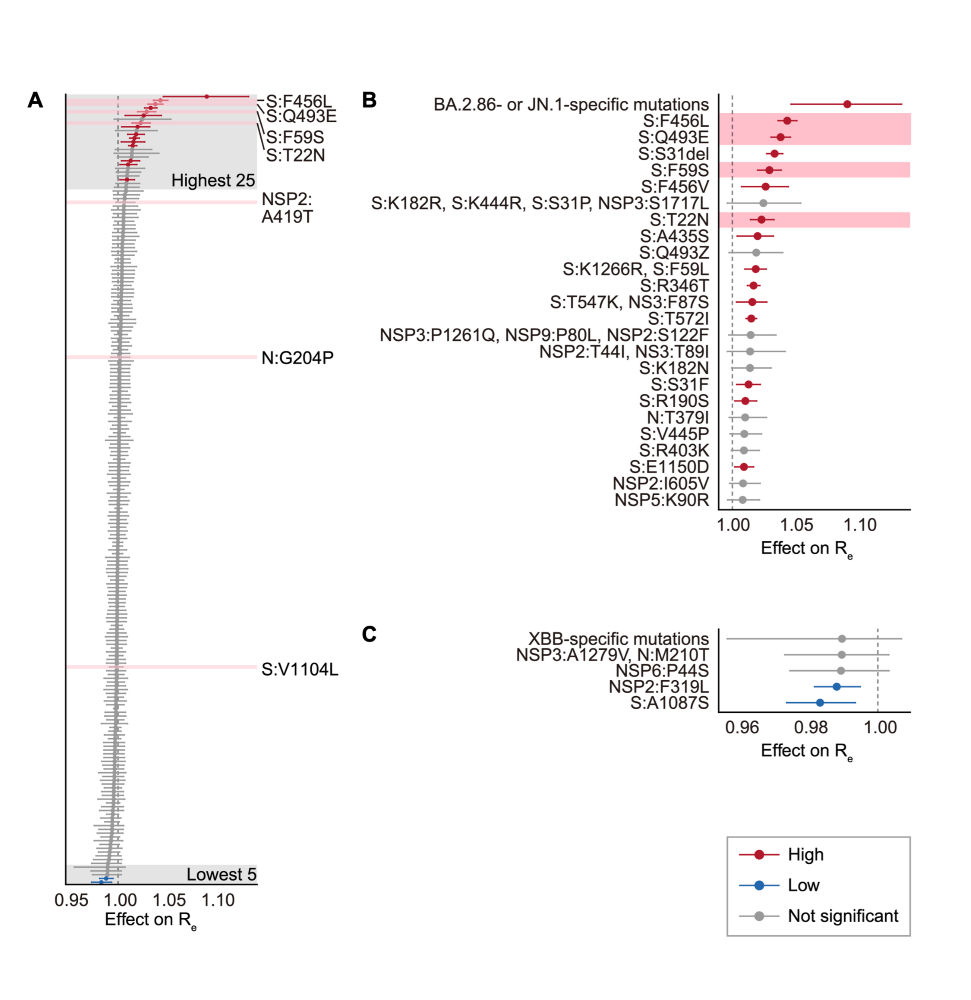 A) ヒト集団での実効再生産数に影響を与える変異の予測。B) 実効再生産数の増加に寄与する変異。XEC 変異株の急速な拡大にはスパイクタンパク質の複数の変異が寄与することが明らかとなった。C) 実効再生産数の低下に寄与する変異。