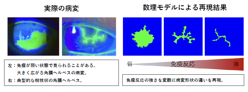 本研究では、感染と免疫の相互作用に着目した数理モデルを用いることで、角膜ヘルペスに見られる多様な病変の形を再現できることを示しました。