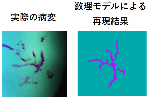 角膜ヘルペスは、枝分かれしたり、先端が丸く膨らんだりと、見た目に特徴のある病気です。医師は病変の形を手がかりに診断を行いますが、なぜそのような形が生じるのかについては、十分に分かっていませんでした。角膜ヘルペスに限らず、病変の「形」は医療において重要な情報を含んでいます。形ができる仕組みを説明する数理モデルの開発が臨床医学の理解につながればと考えています。(増永 真理)