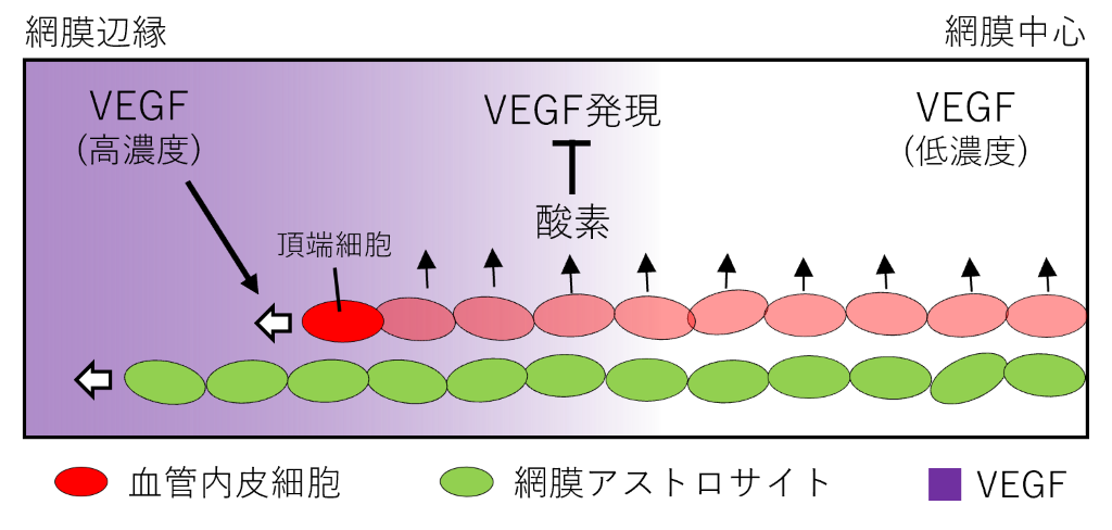 血管伸長に先行して網膜アストロサイト (緑楕円) が拡がり、これを足場として頂端細胞 (Tip cell) が運動した経路上に血管構造 (赤楕円) が形成されると仮定した。この頂端細胞の運動は、血管から供給される酸素によって決定される血管内皮増殖因子分布の勾配に誘引されると仮定した。