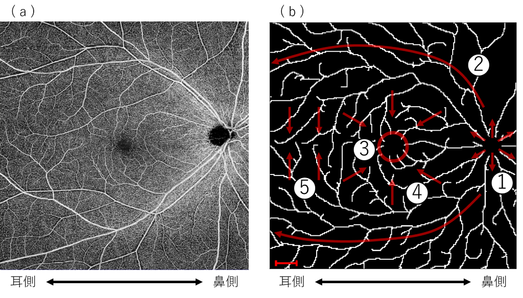 (a): 光干渉断層血管撮影画像。(b): 数理モデル結果図。研究グループが構築した数理モデルは、①視神経円板から放射状に拡がる血管構造、②上下の耳側アーケード血管、③中心窩無血管域構造、④中心窩無血管域へ向かう求心的走行、⑤中心窩無血管域耳側で上下から対面し境界が形成されるような配列といった複数の構造的特徴を再現した。
