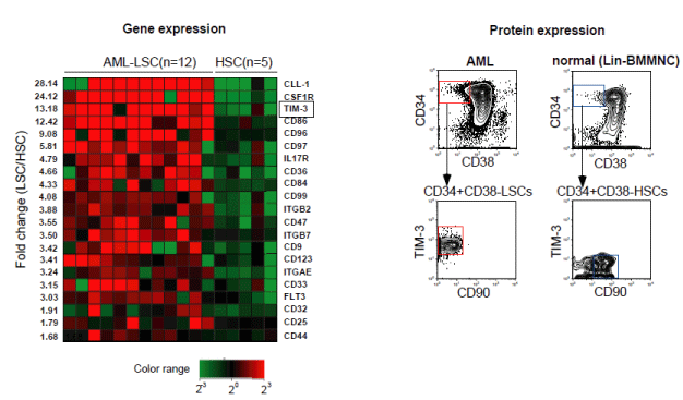 ヒト急性骨随性白血病(acute myeloid leukemia:AML)では、極少数の白血病幹細胞(leukemic stem cells:LSCs)のみが、造腫瘍能を有し白血病細胞集団を維持していることが免疫不全マウスを用いた近年の研究で明らかになっている。AMLは化学療法により一旦は寛解を得られても、残存するLSCsの再増殖によりその多くが再発をきたす。したがって、治癒のためにはLSCsの根絶が必要である。LSCsは正常造血幹細胞(hematopoietic stem cells:HSCs)と同様にCD34+CD38-分画内に存在し、その多くがG0期にあり、細胞周期依存的な化学療法には抵抗性を示す。また自己複製能および骨髄支持構造も正常HSCsと類似した機構を利用しており、LSCsを標的とした治療方法の確立は未だ困難である。今回、我々はLSCsに特異的に発現する細胞表面抗原TIM-3を同定し、有用な治療標的となりうる事を見出した。