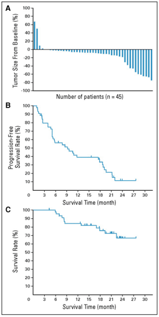 A:RECIST基準による最大の腫瘍径変化率:腫瘍が増大した患者は4名のみで、多くの患者で腫瘍径が減少する傾向であった。