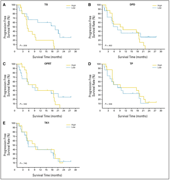 各関連酵素の発現量と無増悪生存率の関係。チミジル酸合成酵素(TS)の発現量が少ないほど無増悪生存期間が有意に長いことが判明した。