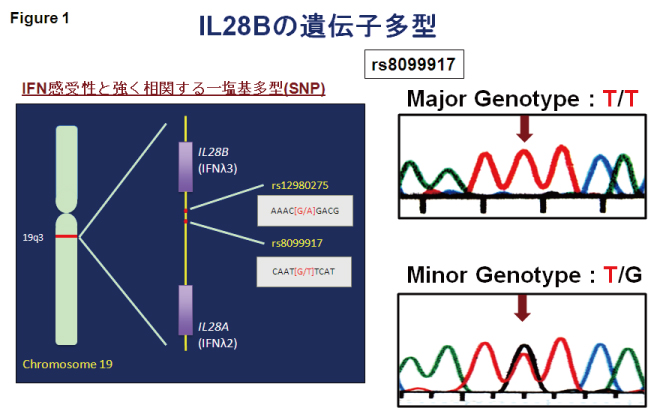 Figure 1: 19番染色体上のIL28Bをコードする周囲のrs8099917領域でT/TがT/Gを示す一塩基多型(SNP)が、インターフェロン(IFN)感受性と強く相関する。