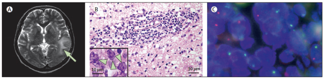 (A) T2-weighted brain MRI showing hyperintense, non-enhancing lesion in the left temporoparietal lobe (arrow) and right frontal lobe; (B) Histopathology showing perivascular accumulation of mononuclear tumour cells with large, indented nuclei (haematoxylin and eosin stain). Inset on the bottom left shows indented nuclei (green arrows); and (C) XY-FISH analysis shows the tumour cells to have an XY genotype. Red chromosome X; green chromosome Y.