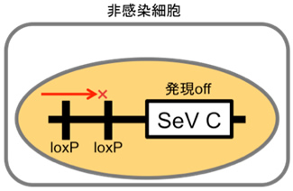 図 Cre-loxPを利用したセンダイウイルスCタンパク質(SeV C)発現システム 左:ウイルス非感染細胞では、SeV Cが発現しないように、2つのloxP配列間で転写がストッ プするようにしておく。この細胞は、正常な免疫応答をするのでウイルスに抵抗性である。 右:Creを発現する麻疹ウイルスが感染すると、Creの働きによりloxP間の配列が切り取られ、下流のSeV Cが発現する。 そのため、免疫応答が抑えられ、ウイルスはより良く増殖するようになる。 |