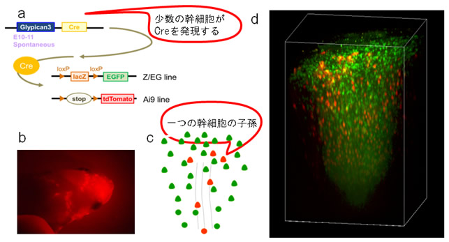 同じ神経幹細胞から生み出された細胞を同定するために、遺伝子組換えマウスを用いました。この遺伝子組換えマウスは、共同研究者のカルロス・ロイス博士らにより開発されたもので、ごく少数の神経幹細胞でのみ遺伝子組換えが起こり、その子孫の神経細胞が全て蛍光たんぱく質で標識されます(図3a、b)。この遺伝子組換えマウスと2光子顕微鏡を用いて、生きたままのマウスの脳で、蛍光たんぱく質で標識された同じ神経幹細胞から生み出された神経細胞を観察しました(図3c)。マウスの脳内にある個々の神経細胞の方位選択性を調べるために、私たちが2005年に世界で初めて開発した、2光子カルシウムイメージングによる機能マッピング注5)という方法を用いました(図1a)。この方法を用いると、何千もの脳内の神経細胞の活動を同時に計測し、どのような視覚刺激を与えた時に、それぞれの神経細胞が反応するか、細胞の方位選択性を調べることができます。