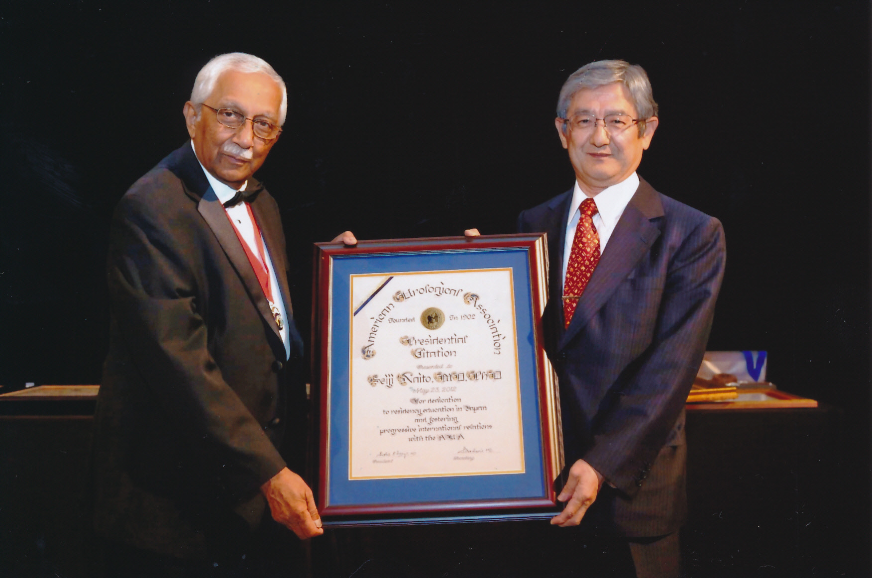米国泌尿器科学会理事長より盾の授与 (左:米国泌尿器科学会理事長 Sushil S. Lacy, MD 右:内藤誠二教授) |