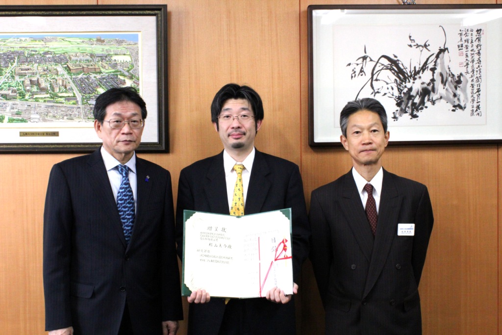 ![]() 左:片野医学研究院長 中央:杉山先生 右:松本年記事務局長 |