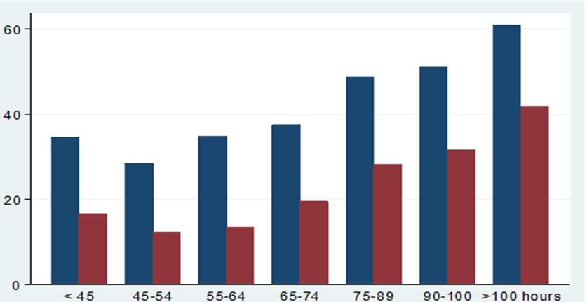 | 青 燃えつき症候群の割合(%) 赤 重篤な燃えつき症候群の割合(%) 縦軸 燃えつき症候群の割合(%) (図2)労働時間/週当たりと燃えつき症候群の割合 |