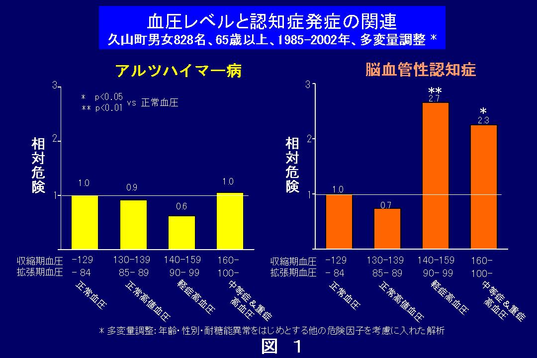 九大久山町研究班は、昭和36年から久山町で脳卒中の追跡調査(久山町研究)をしているが、昭和60年からは高齢者の認知症の調査も行っている。久山町研究の特徴の一つに、追跡期間中に亡くなられた方を高率に剖検(高齢者の70%)している事があげられる。アルツハイマー病や脳血管性認知症の確定診断には剖検が必要なので、剖検を基盤に行う久山町の認知症の研究は極めて精度が高い。同研究班は診断精度の高いデータをもとに、アルツハイマー病と高血圧および耐糖能異常との関係を検討した。