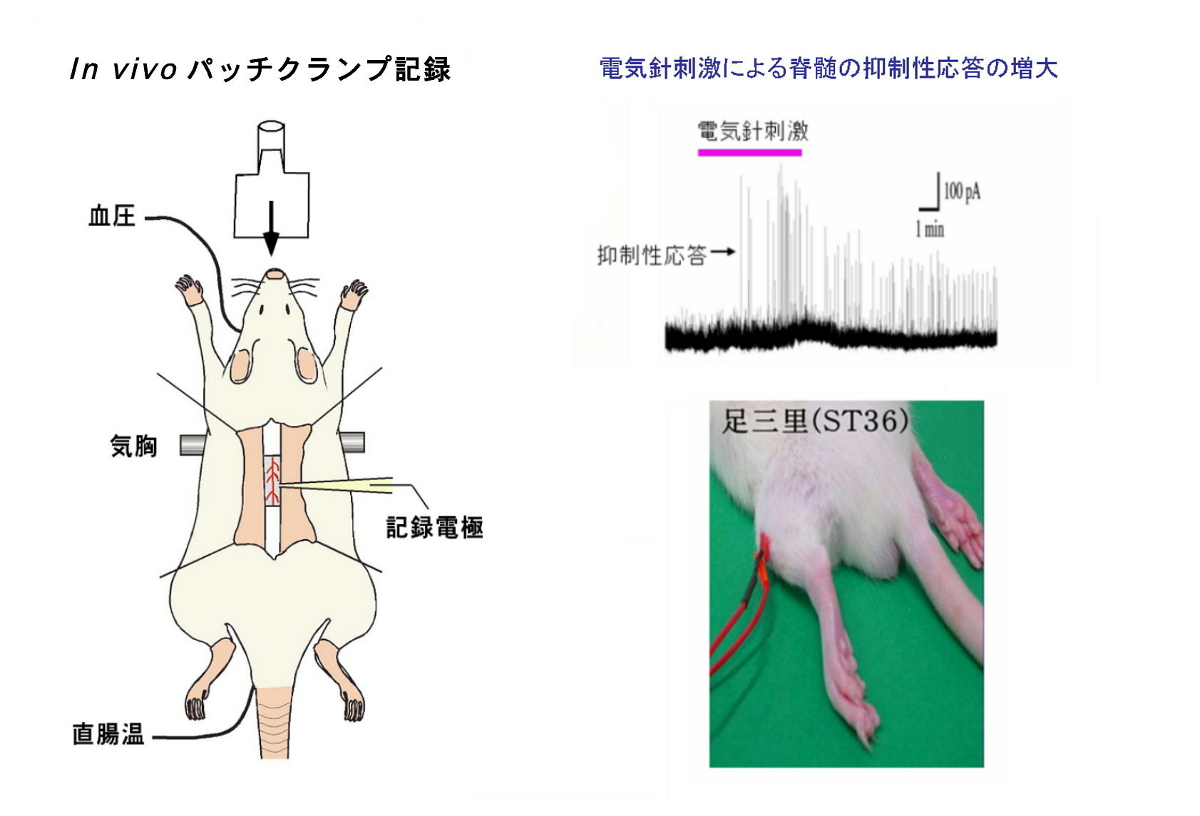 <イラスト等の説明>左図はin vivoパッチクランプ法を示す。ラットの足三里を刺激した場合(右下写真)のin vivoパッチクランプ法で記録した脊髄の抑制性応答信号が右上図。