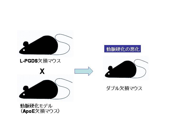 痛みや血管の炎症を引き起こす原因物質として発見されたというPGは、一方で血圧や心機能、睡眠などの様々な生理的作用を調整し、ホルモンのように働いている。同教室では、「PGの一つであるPGJ2が血管細胞に保護的に作用する」ことをすでに発表し、これを動脈硬化予防・治療薬として応用しようとしている。動物実験では、PGJ2の合成に必要な酵素(L-PGDS)を産生することが出来ないマウスと、動脈硬化を起こしやすいマウスとの間に生まれたマウスに、脂肪分の多い食事を与え続けると、動脈硬化が進行する傾向が見られた(イラスト参照)。また逆に人工的に動脈硬化を起こしたラットの血管に、L-PGDS遺伝子を導入すると、血管の炎症が抑えられていることが分かった。これらの結果は、「動脈硬化の原因となる血管の炎症を、PGJ2が抑える」ということを示すものだ。