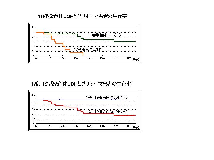 脳腫瘍で最も多いグリオーマ患者の生存率の比較。10番染色体の欠損があると多くの患者の生存期間は2年以内であった。1番と19番の染色体異常があると生存期間は延長している。