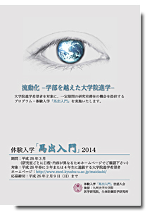 九州大学(馬出地区)では、大学院進学希望者を対象に、一定期間の研究室滞在の機会を提供するプログラム・体験入学「馬出入門」2014を実施します。研究室では、このプログラムの受入研究室として参加します。詳細は、体験入学「馬出入門」ホームページよりご覧下さい。 体験入学「馬出入門ポスター」2014ポスター(画像をクリックすると大きく表示します。)