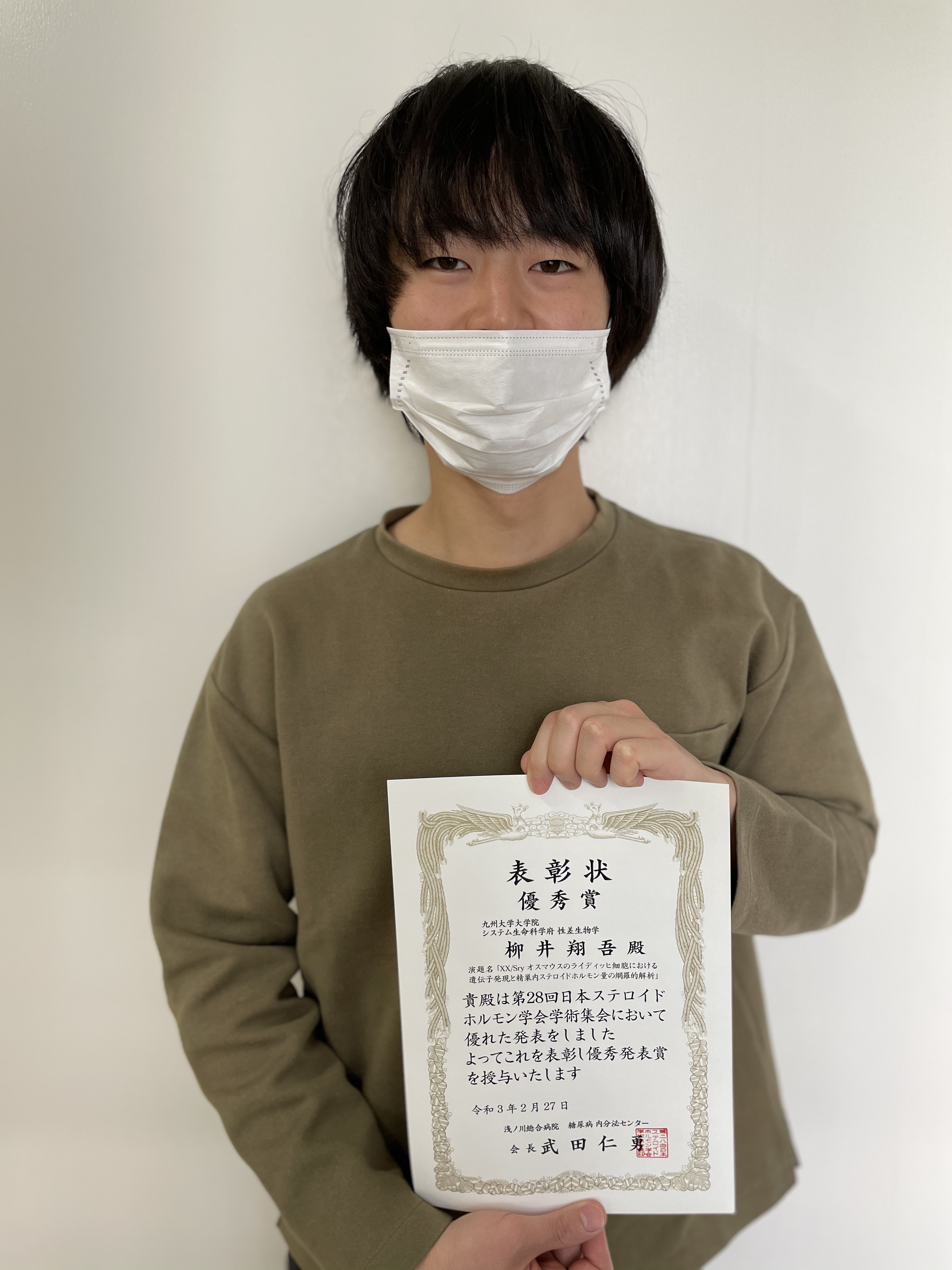 大学院生の柳井翔吾が、第28回日本ステロイドホルモン学会オンライン学術集会 にて「XX/Sryオスマウスのライディッヒ細胞における遺伝子発現と精巣内ステロイドホルモン量の網羅的解析」の演題で講演し、日本ステロイドホルモン学会優秀演題賞を受賞しました。