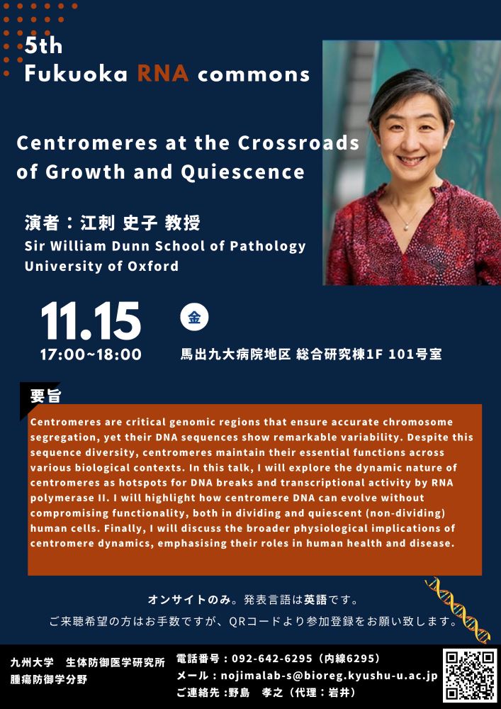要旨:Centromeres are critical genomic regions that ensure accurate chromosome segregation, yet their DNA sequences show remarkable variability. Despite this sequence diversity, centromeres maintain their essential functions across various biological contexts. In this talk, I will explore the dynamic nature of centromeres as hotspots for DNA breaks and transcriptional activity by RNA polymerase II. I will highlight how centromere DNA can evolve without compromising functionality, both in dividing and quiescent (non-dividing) human cells. Finally, I will discuss the broader physiological implications of centromere dynamics, emphasising their roles in human health and disease.